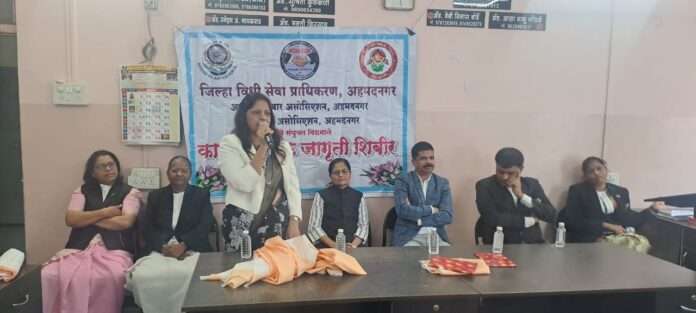 प्रमुख जिल्हा व सत्र न्यायाधीश तथा जिल्हा विधी सेवा प्राधिकरणाच्या अध्यक्षा अंजू शेंडे यांच्या मार्गदर्शनाखाली जिल्हा विधी सेवा प्राधिकरण आणि अहमदनगर बार आसोसिएशन यांच्या संयुक्त विद्यमाने महिला विधिज्ञ बार रूममध्ये कायदे विषयक जागृती शिबिराचे आयोजन करण्यात आले होते. त्याप्रसंगी वरिष्ठ स्तर सह दिवाणी न्यायाधीश यु. टी. मुसळे बोलत होत्या.