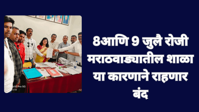 School closes on 8 and 9 July शिक्षक शाळा आणि शिक्षण संस्थेच्या विविध प्रश्नाच्या पूर्ततेसाठी मराठवाडा शिक्षक संघाने दिनांक आठ आणि नऊ जुलै रोजी मराठवाड्यातील शाळा बंद राहणार असल्याचा इशारा दिला आहे.