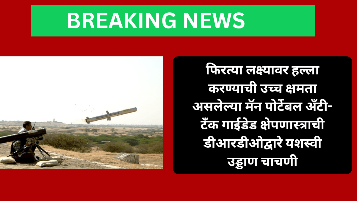 डीआरडीओच्या हैद्राबाद स्थित संरक्षण संशोधन आणि विकास प्रयोगशाळेने महाराष्ट्रातील अहिल्यानगर येथील केके रेंजमध्ये फिरत्या लक्ष्यावर हल्ला करण्याची उच्च क्षमता असलेल्या थर्ड जनरेशन फायर अँड फॉरगेट मॅन पोर्टेबल अँटी-टँक गाईडेड (एमपीएटीजीएम )क्षेपणास्त्राची यशस्वी उड्डाण चाचणी घेतली .